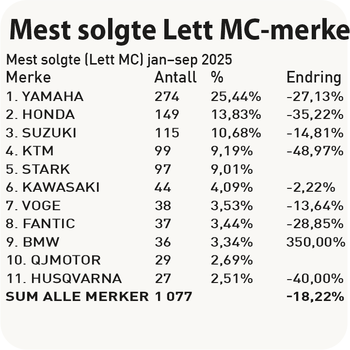 Yamaha troner suverent når det gjelder 125-salget. Over 1/4 av lettvekterne som er blitt solgt til nå i år har en Yamaha-logo på tanken. Honda og Suzuki dekker resten av pallen. Mopedsalget fortsetter oppgangen, og kan nå skilte med 10,43 % økning i salget.