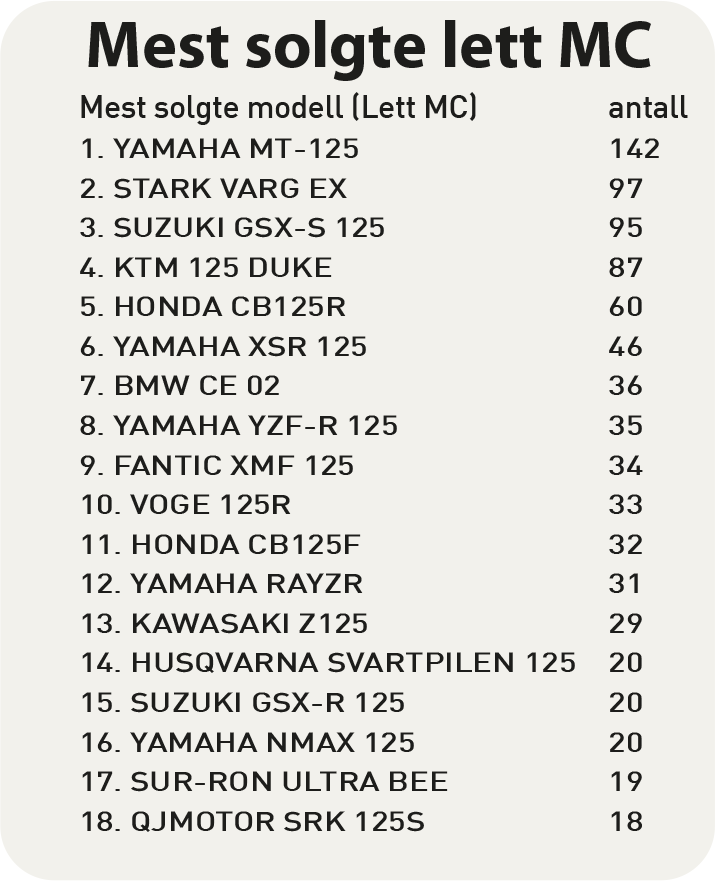 Yamaha sin storselger, MT-125, fortsetter å imponere. Den ligger suverent på toppen av modellesalget med 142 stk. Stark sin elektriske enduromodell Varg EX ligger nå på 2. plass med 97 stk. Denne kjøpes nok av eldre motorsyklister som liker å kjøre utenfor asfaltveier. På 3. plass kommer street-modellen Suzuki GSX-S 125. KTM Duke 125 er ennå populær, og ligger på 4. plass.