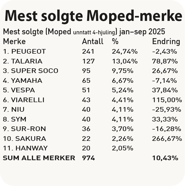 Oppgangen i 50cc-salget var på 43,28 % i september. Det gjør at den totale oppgangen går fra 7,73 i august til 10,43 % i september. Peugeot sine scootere topper salget, foran Talaria, Super Soco, Yamaha og Vespa. Taralia selger elektriske enduro-sykler som for det meste kjøres utenfor asfaltveier.