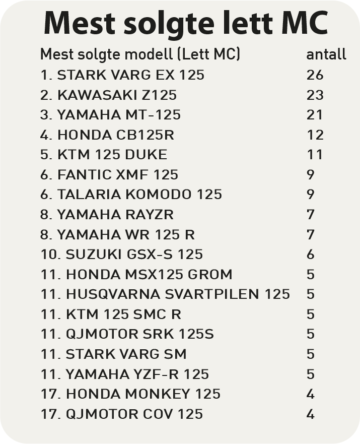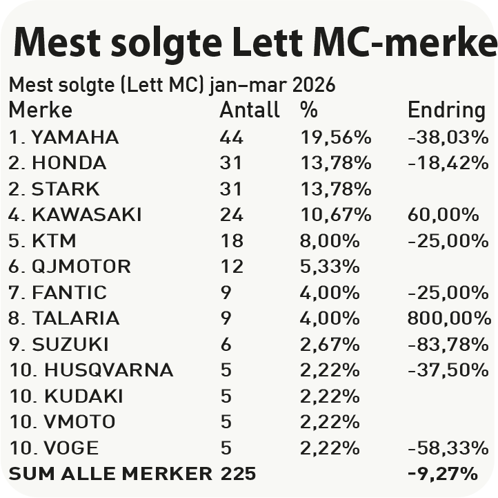 Mars-salget for lettvekterne har en oppgang på 0,63 % ut mars. Som vi skrev i fjor så er enduromodellen Stark Varg EX 125 populær i Norge. Stark har i år kommet med supermotarden SM 125 og ligger på 2. plass på merkestatististikken sammen med Honda. Yamaha beholder førsteplassen mye takket være storselgeren MT-125. Kawasaki kjører kampanjepris på Z125 og denne ligger nå på 2. plass på modellstatistikken.