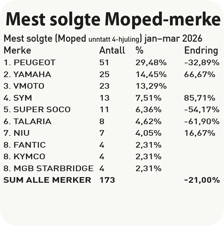 Det er til nå en nedgang på mopedsalget på -21 %. Dette er fra små tall, så vi får vente til mai er over. På salgstoppen troner Peugoet foran Yamaha, VMoto, Sym og Super Soco. VMoto og Super Soco kommer fra samme produsent. VMoto er det nye navnet.