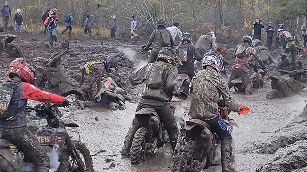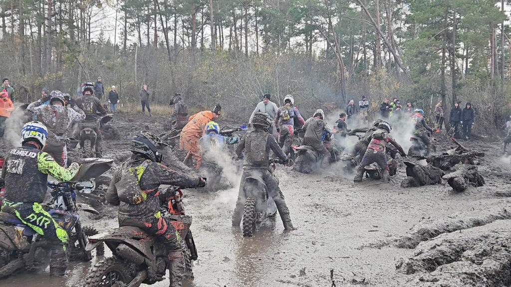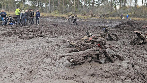 Etter starten og «korken» i første sving ble det mer fart på feltet, men det skulle raskt vise seg at det stoppet opp igjen lenger fremme. Det var usedvanlig mye vann og gjørme i løypa og flere og flere stoppet, vurderte sporvalg, veltet eller satt seg fast. Jeg ønsket fremdrift å så etter andre som valgte spor gjennom vann og gjørme uten å sette seg fast, og fulgte deretter i samme spor. Lenger ut i løypa måtte også jeg erkjenne at gjørma tok overhånd. Jeg satt fast med en sykkel foran i sporet og en bak. Alle tre satt fast. Vi var både slitne og fulle av adrenalin, men klarte å hjelpe hverandre ut etter hvert. Første runde var krevende, og jeg brukte mye lenger tid enn forventet og valgte derfor å kjøre inn i banedepoet for å fylle bensin i frykt for å gå tom for bensin på runde to. Ulempen med en motocrossykkel er at den har mindre bensintank enn endurosykkelen. Lengre tid enn beregnet pr runde i tillegg til tungt gjørmete føre fryktet jeg ville medføre stopp pga bensinmangel på runde to. Det tapte jeg 15 plasser på, men jeg ville tapt enda mer hvis jeg gikk bensintom på runde to.