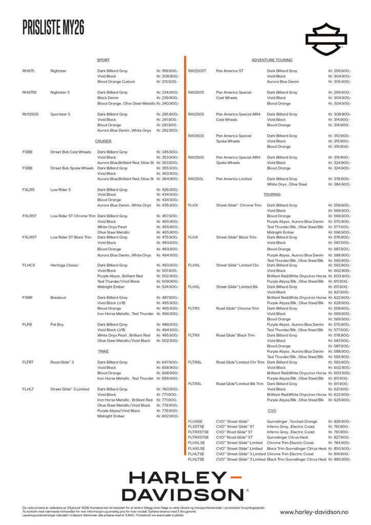 Harley har definitivt gjort noe med prisnivået på enkelte av modellene for 2026. Tidligere i år gikk Nighster, Harley sin instegsmodell ned ca 60.000,- i pris. Dette er helt sikkert etterlengtet både av forhandlerne og potensielle kunder. Nå får du altså en Harley-Davidson for under 200.000,-. Tidligere måtte man punge ut med over 260.000,- for samme sykkel.