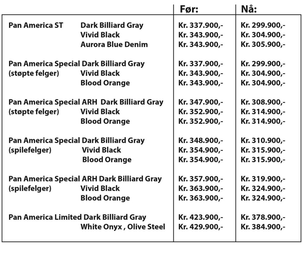 Nå er det Pan America modellene som står for tur. Vi ser at de fleste modellene blir 40.000,- billigere og da blir det lettere å ta opp kampen med de andre i det populære Adventure-segmentet. De rimeligste utgavene smyger akkurat under 300.000,-. Så nå blir det spennende å se om det er dette som skal til for at flere velger adventure-sykkel fra Harley-Davidson.