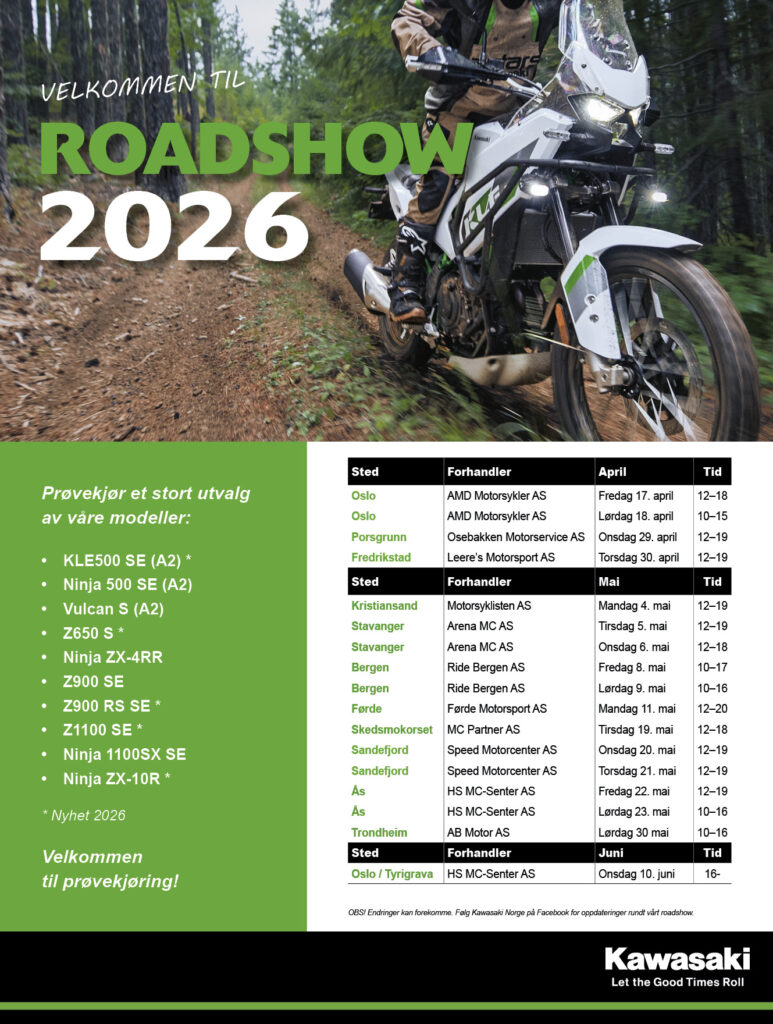 Det er vår, snøen er borte, og da er det tid for Kawasaki Roadshow. Over ser du når de er på dine kanter. Benytt sjansen til en uforpliktende prøvekjøring av årets modeller!