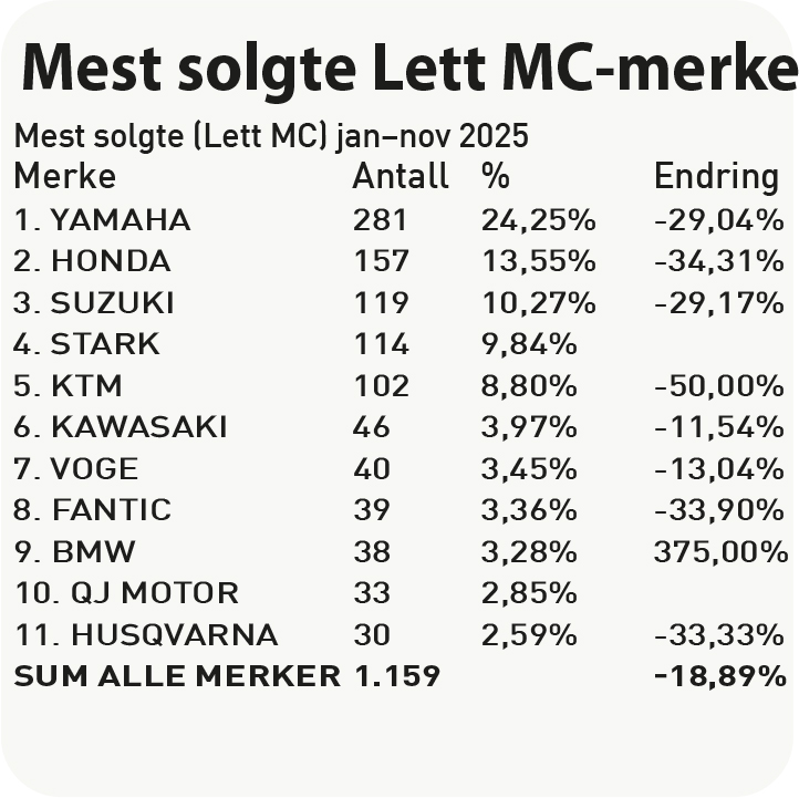 Lettvektersalget var status que i november med 33 registrerte enheter. Det er Yamaha som suverent topper listen med Honda på 2. plass. Suzuki tar den siste pallplassen, men blir pustet i nakken av elektriske Stark som hatt storselgeren i høst med Stark Varg EX.