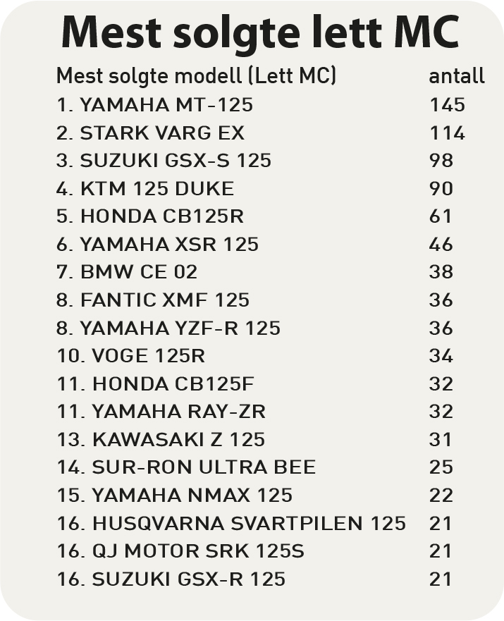 Det er Yamaha MT-125 som nok en gang troner på toppen når det gjelder lettvektersalget. I høst har den elektriske enduroen Stark Varg EX 125 solgt i bøtter og spann, og ligger nå på 2. plass. Suzuki GSX-S 125 tar den siste pallplassen. Deretter kommer street-modellene KTM 125 Duke, Honda CB125R og Yamaha XSR 125. BMW sine to elektriske CE-O2 scootere ligger på 7. plass.