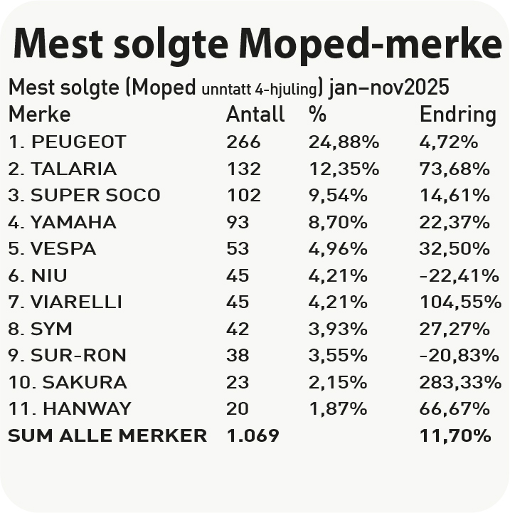 Mopedsalget har hatt en oppgang på 11,7 % i år, og det er gode nyheter etter flere år med tilbakegang. Alle de tre merkene på pallen har en oppgang, Peugeot med 4,72 %, Talaria med 73,68 % og Super Soco med 14,61 %.