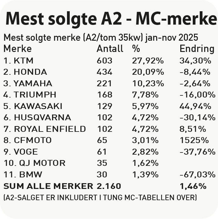 Oppgangen ut november på A2-salget er på 1,46 %. Det er KTM som troner suverent i toppen, foran Honda og Yamaha.