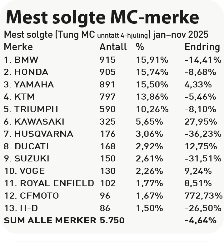 Det er få antall i registreringer de siste månedene av året. I november ble det registrert 112 stk tunge MC, 33 stk. lette og 39 mopeder. Dette betyr at det ikke er så mange endringer på statistikkene. Når det gjelder tunge MC, var det BMW som vant novembersalget med 22 stk, foran Triumph med 18 stk, Honda med med 16 stk og Yamaha med 15 stk. BMW siger nå ifra Honda og Yamaha, og hvis trenden fortsetter blir BMW salgsvinneren i 2025.