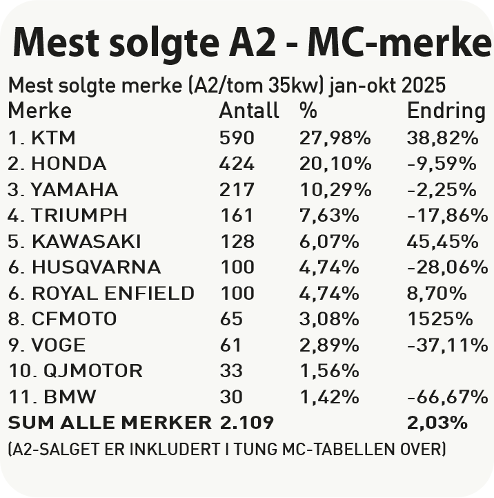 A2-salget har ut oktober en oppgang på 2,03 %. Det er KTM som topper listen foran Honda, Yamaha, Triumph, Kawasaki og Husqvarna. Royal Enfield og Husqvarna deler 6. plassen med et salg på 100 stk, og har da nådd tresifret i år.