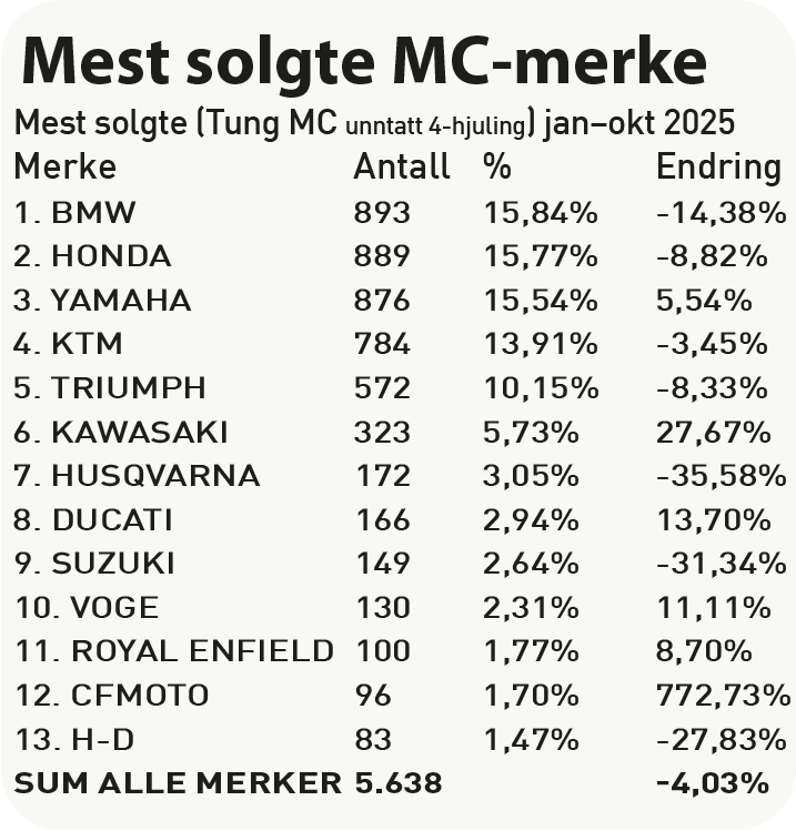 MC-salget Tung MC jan-okt25: BMW og Honda kniver om 1. plassen!