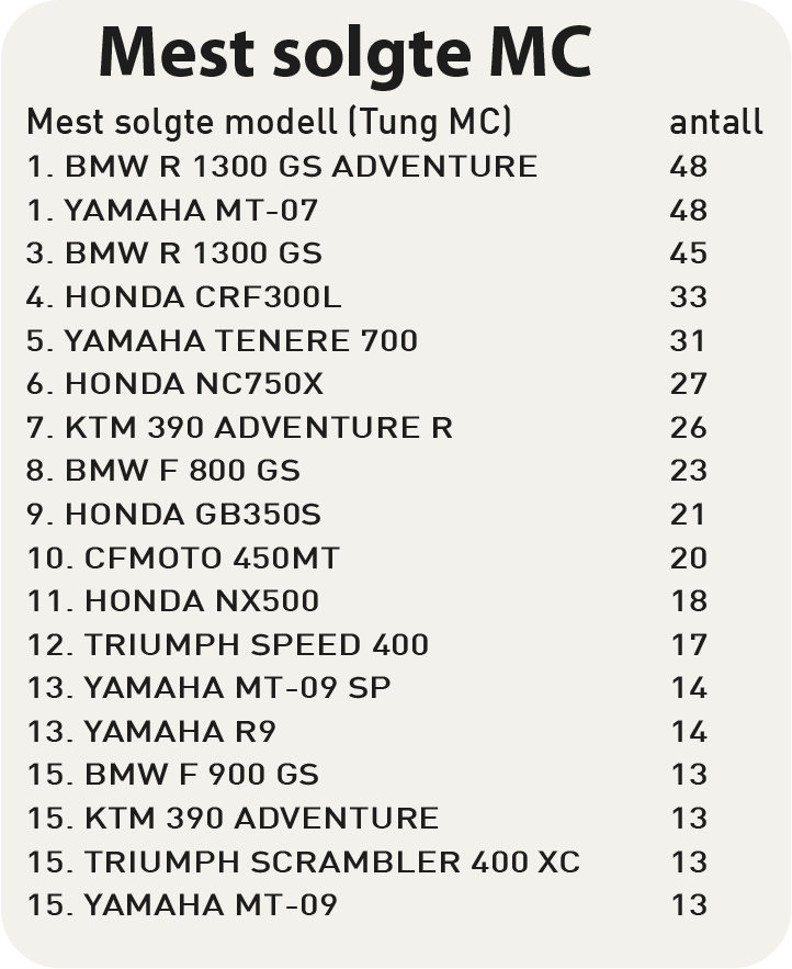 Det har vært kald start på 2026 og spesielt februar ble kald for mange. Dette er ikke akkurat positivt for MC-interessen. Etter MC-messen i månedskiftet februar/mars har salget tatt seg opp og det var en oppgang på 4,98 på tung MC i mars. Det er flere nyheter som ennå ikke har kommet til MC-forhandlerne så en må nok vente til mai-tallene blir sluppet før en får bedre oversikt.