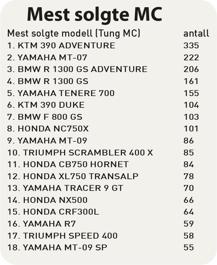 Det er KTM sine 390-modeller som topper salget med 335 og 104 nysalg. Deretter kommer Yamah MT-07 med 93 stk, Triumph Scrambler 400X med 85 stk, Honda NX500 med 66 stk og Honda CRF300L med 64 nysalg.