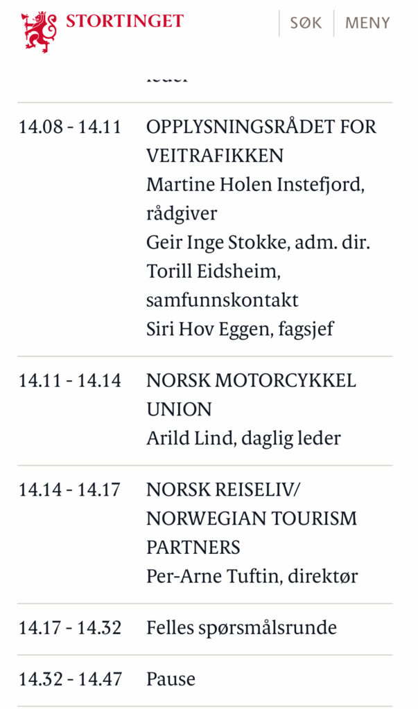 Pressemelding: Som eneste motorsykkelorganisasjon er NMCU gitt innpass i høringen om statsbudsjettet hos Transport- og kommunikasjonskomiteen på Stortinget.
