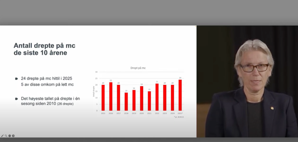 Statens vegvesen, med avdelingsdirektør for sikkerhet Guro Ranes i spissen, inviterte 9. oktober til en oppsummering av MC-sesongen på YouTube. Ranes hadde med seg ressurspersoner fra Statens vegvesen, Trygg trafikk, NMCU og UP i et samordnet team som oppsummerte årets MC-sesong. På listen over aktører som ellers bidrar i dette arbeidet finner vi: